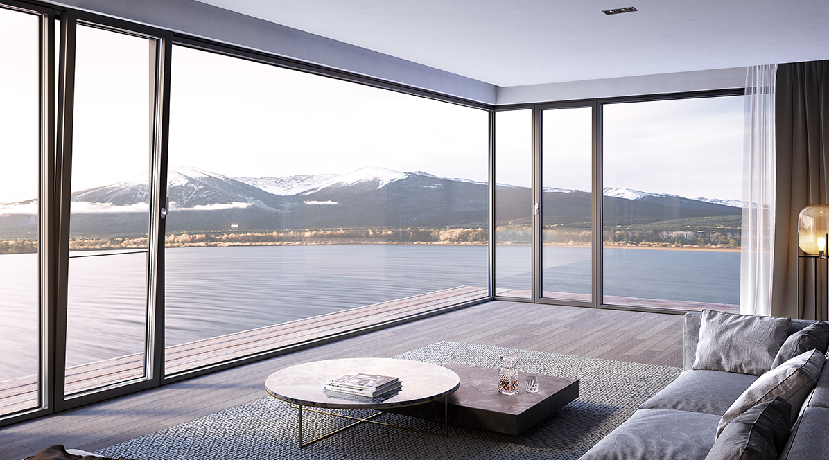 门窗本身宽幅要大,要求结构强度要大,然后隔音、防紫外线。室外景色好看以后,这个窗就像是画框一样